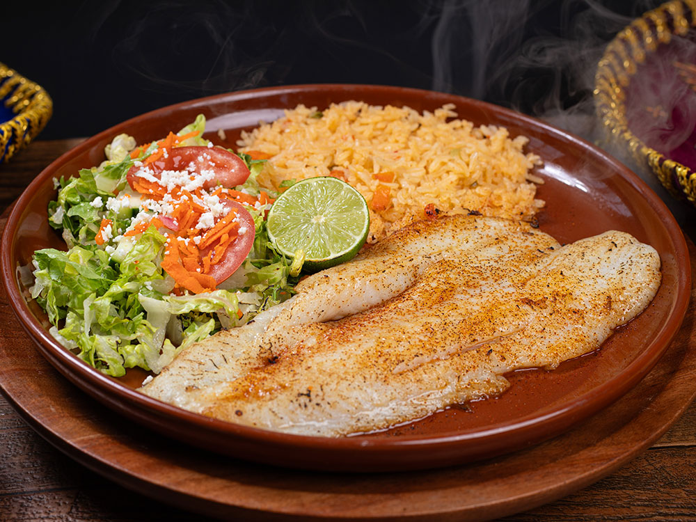 Fish fillet grilled in a butter garlic sauce. Served with rice, salad, pico de gallo and lime.