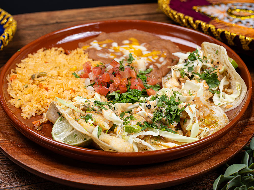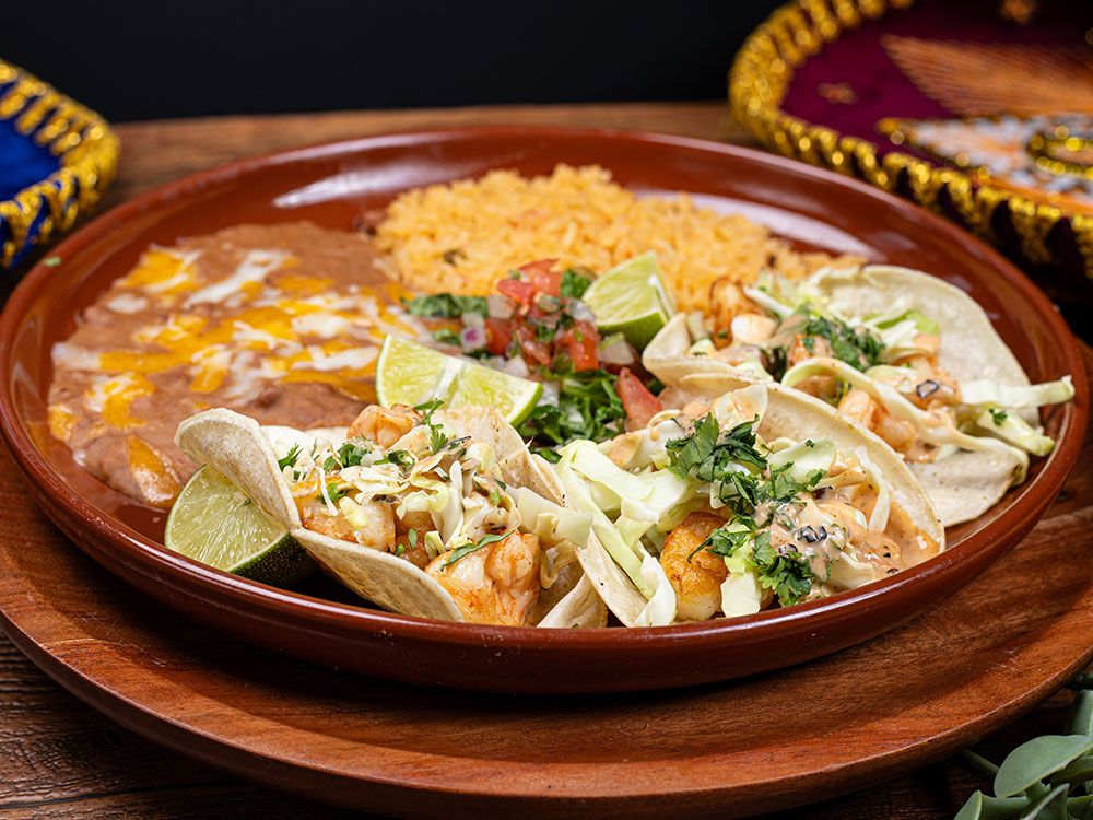 Three corn tortillas with sautéed shrimp, garnished in a creamy jalapeño baja coleslaw and cilantro. Served with rice and beans.