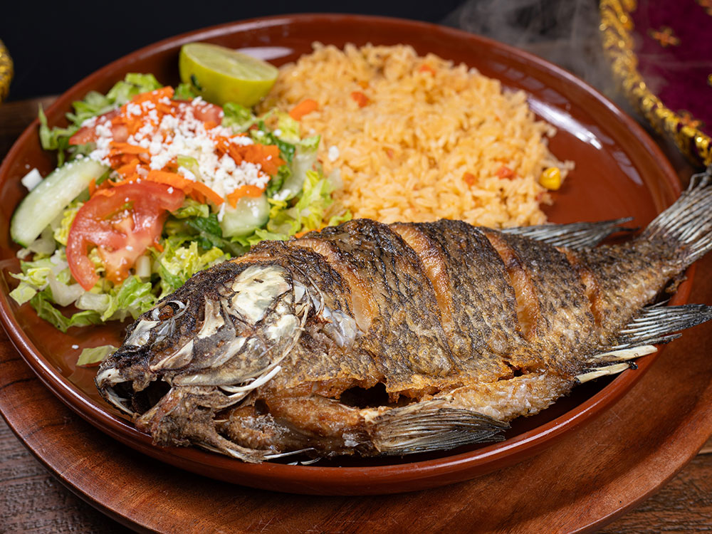 Whole tilapia fish. Served with rice, salad, tomato, onion and lime.
