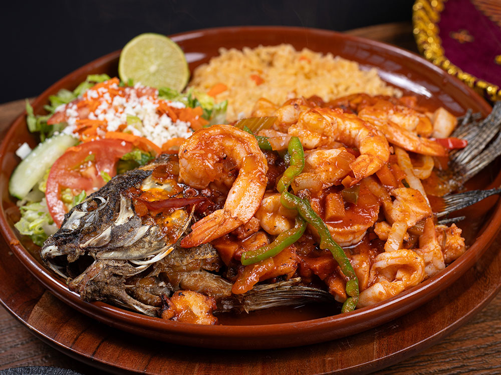 Whole tilapia fish, topped with sautéed shrimp, octopus, scallops,onion, red and green bell pepper simmered in red sauce. Served with rice, salad, pico de gallo and lime.