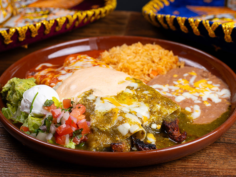 Two flour enchiladas with steak and chicken fajitas, topped with red, green tomatillo, and homemade creamy sauce. Served with rice, beans, lettuce, pico de gallo, guacamole and sour cream.