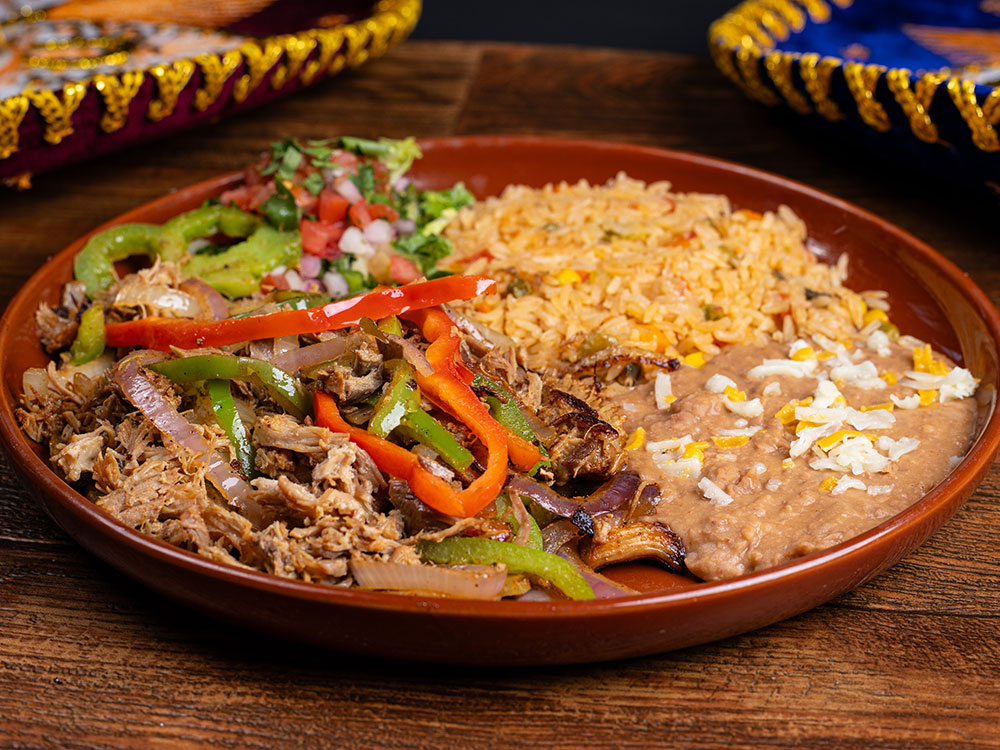 Slowly cooked pork carnitas with onion, red and green bell pepper. Served with rice, beans, lettuce and pico de gallo.