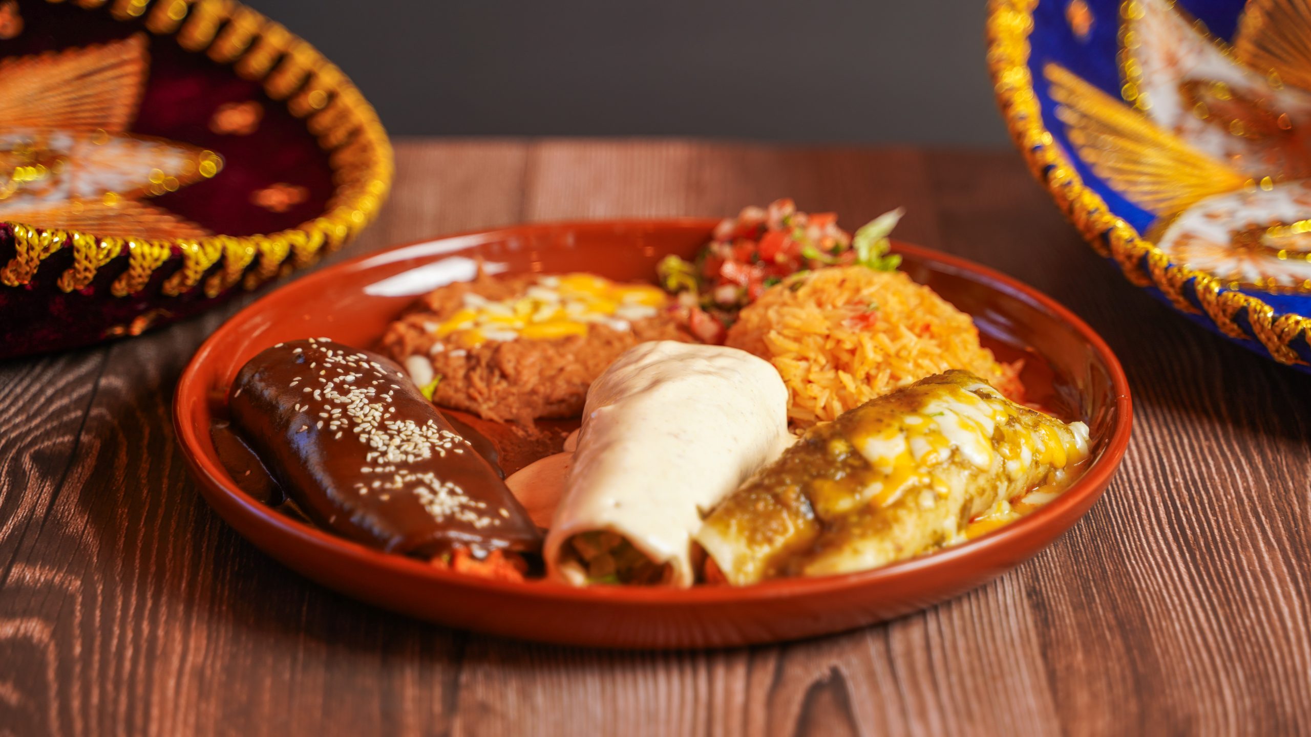 Three Chicken enchiladas topped with mole, tomatillo sauce, and white creamy sauce. Served with rice and beans,  lettuce, pico de gallo.