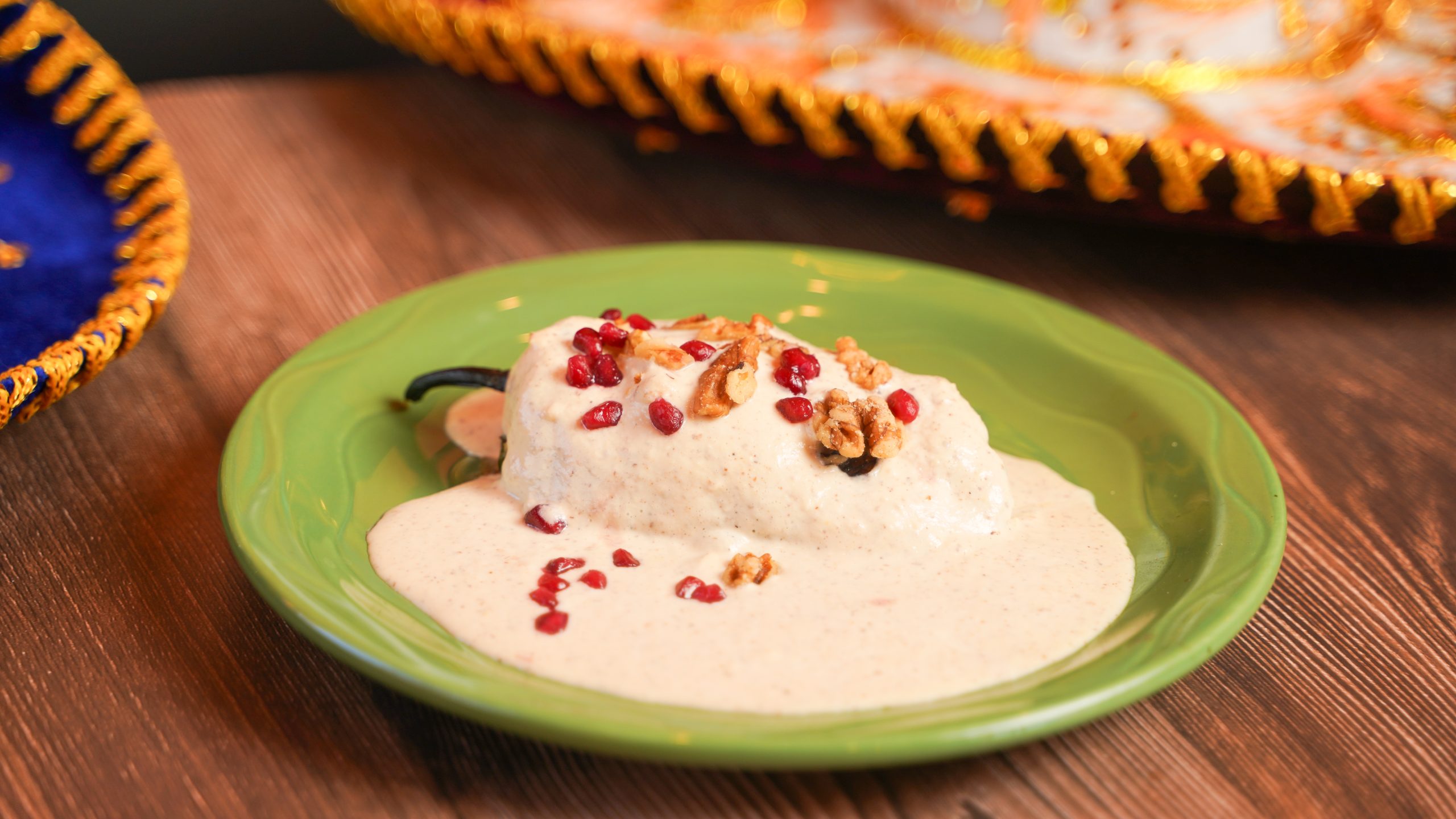 Roasted poblano pepper stuffed with apple, raisins, walnuts,  choice of picadillo, ground beef, or chicken. Cooked with creamy walnut sauce, pomegranate seeds, cilantro and walnut.