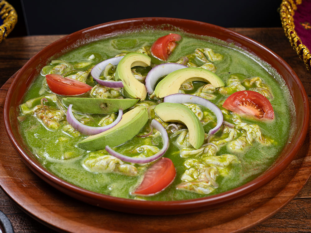 Shrimp cooked in a sauce made of jalapeño, cilantro and lime – juice, garnished with slices of onions, avocados and tomatoes and cucumbers.