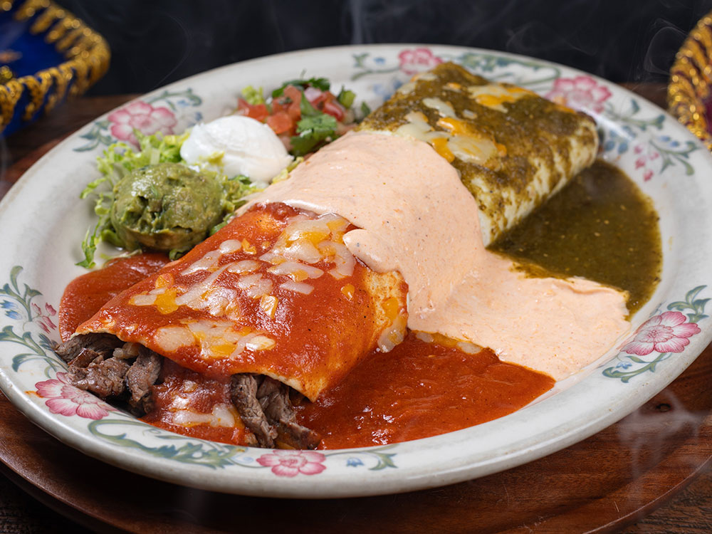 Grilled skirt steak, rice and beans inside, topped with green tomatillo sauce, white creamy sauce and red enchilada sauce. Served with lettuce, pico de gallo, sour cream and guacamole.
