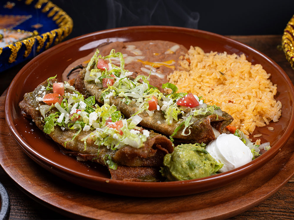 Two roasted Anaheim peppers stuffed with Monterey cheese and wrapped in a egg roll, topped with green tomatillo sauce, lettuce, tomato and queso fresco. Served with rice, beans, guacamole and sour cream.