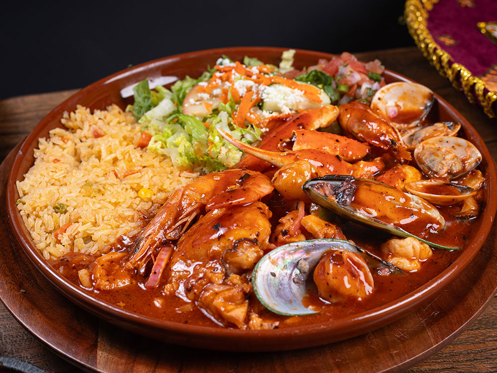 Crab legs, fish, scallops, octopus, mussels and jumbo shrimp sautéed then simmered in our homemade Diabla sauce, garnished with pico de gallo. Served with rice and salad.