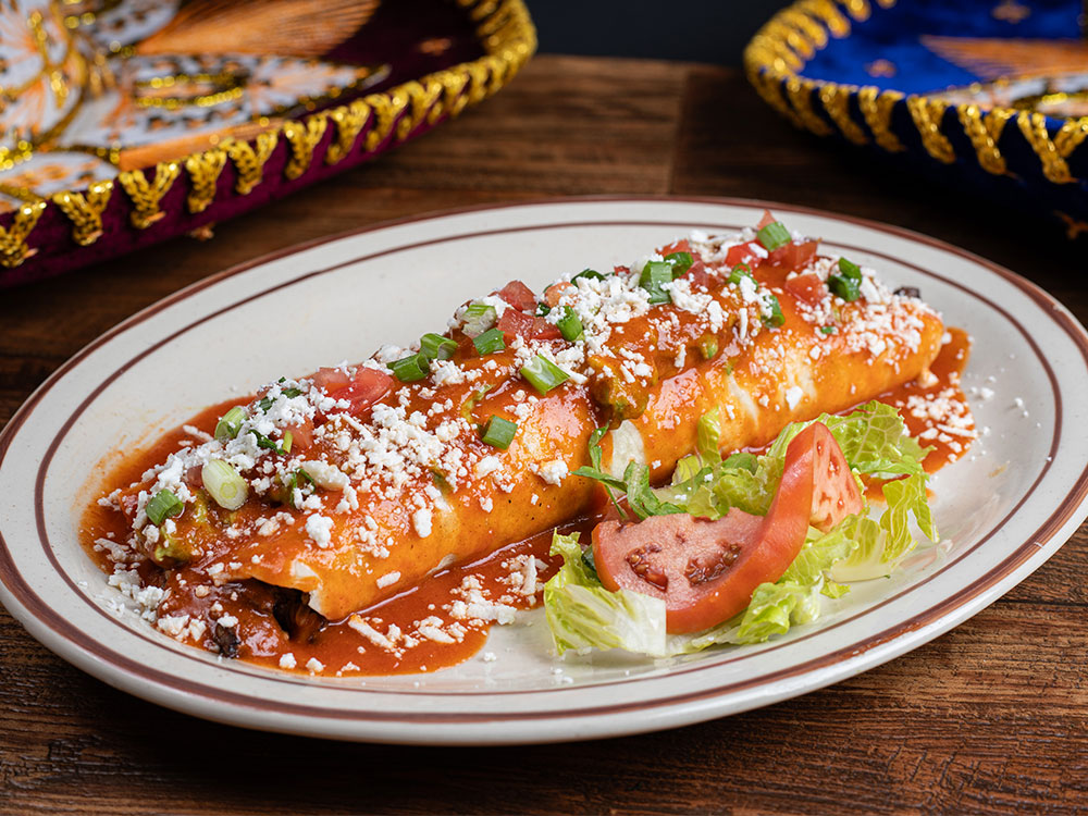 Skirt steak, rice and beans inside, topped with guacamole, red enchilada sauce and queso fresco. Served with lettuce, green onion and tomato slice.