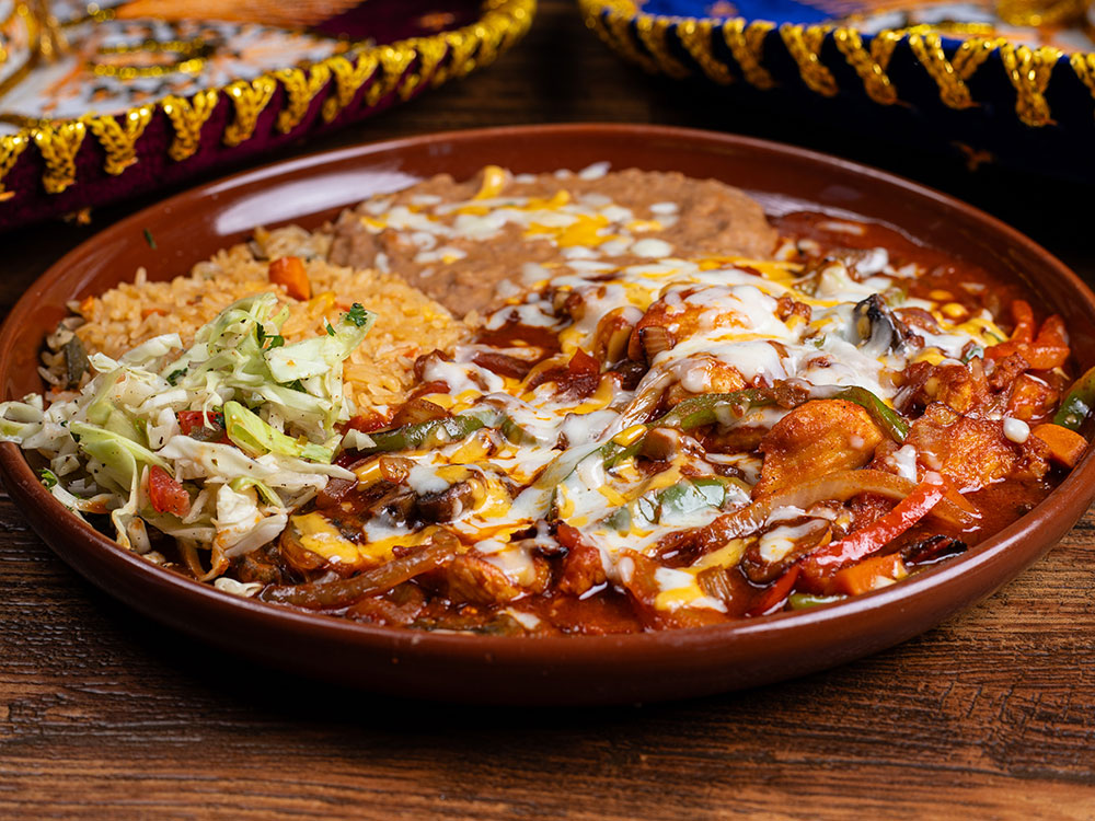 Chicken breast strips sautéed with mushroom, red and green bell pepper in a homemade Merlot-Tequila sauce, topped with melted cheese. Served with rice, beans and coleslaw.