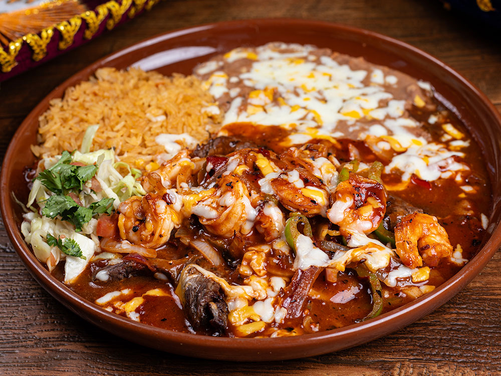 Skirt steak topped with sautéed shrimp, onion, red and green bell pepper and melted cheese, simmered in homemade Diabla sauce. Served with two sides of rice, beans and coleslaw. Sub Chipotle sauce +2.00