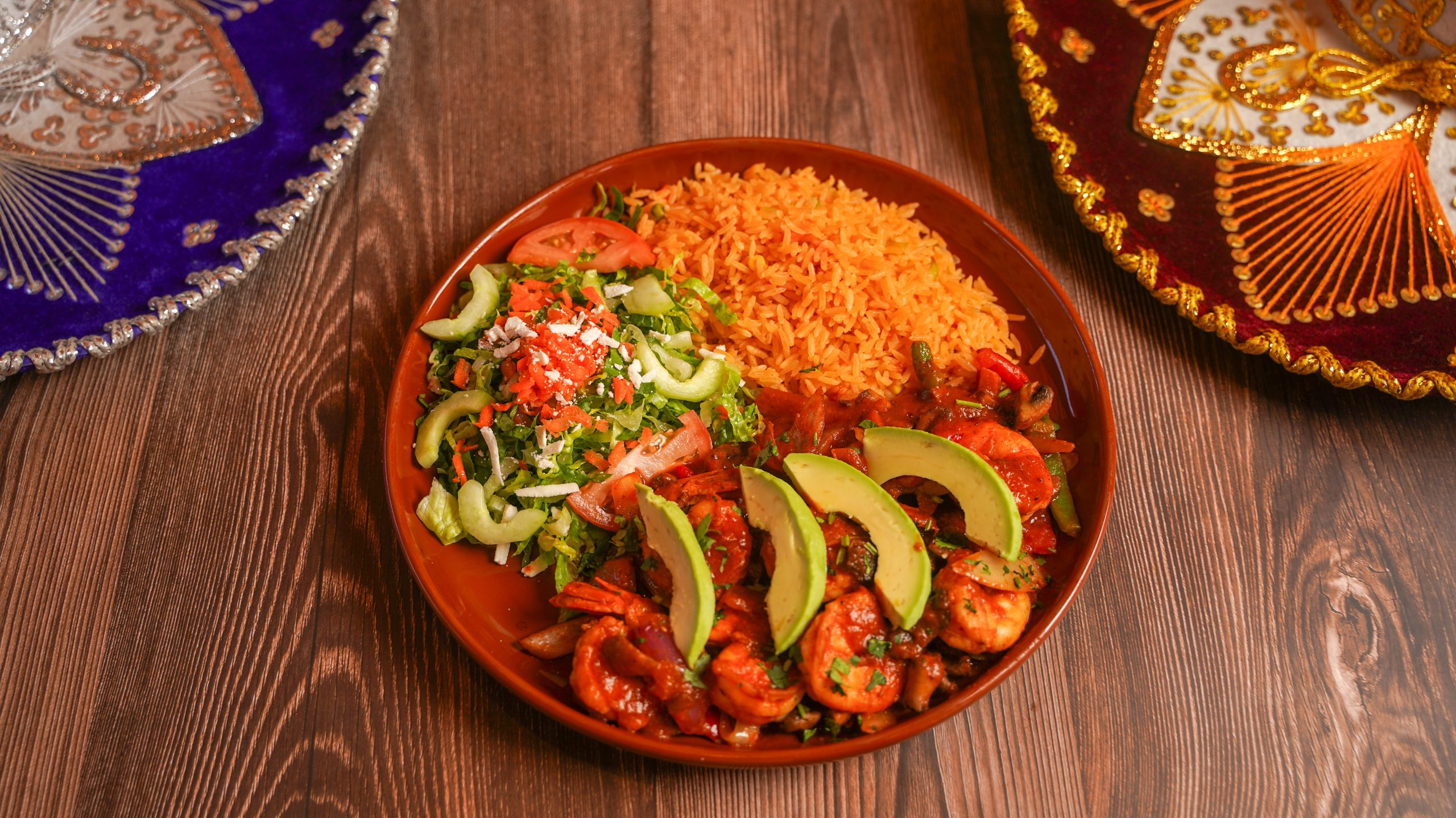 Shrimp sautéed with onion, red and green bell pepper, mushrooms, green or red sauce, garnished with cilantro and avocado. Served with rice and salad