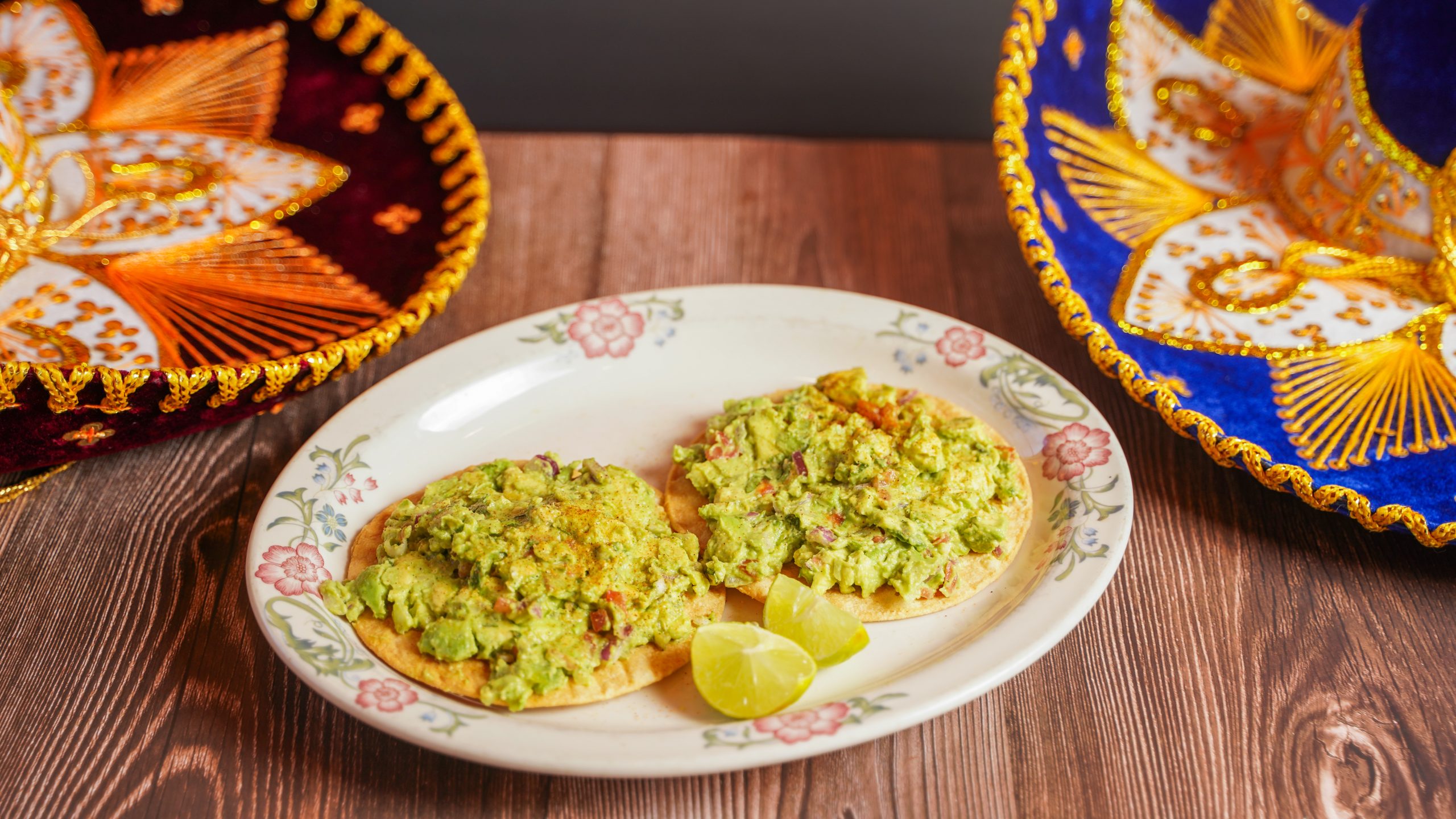 Two corn tostadas topped with with avocado, onion, tomato, cilantro, lime, seasonings, and salt.